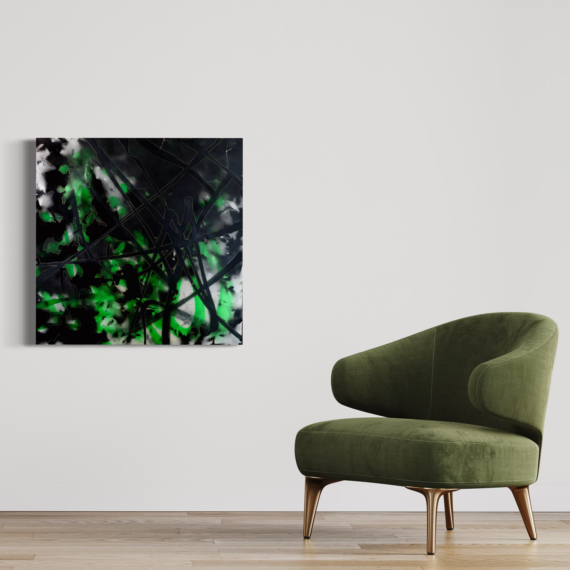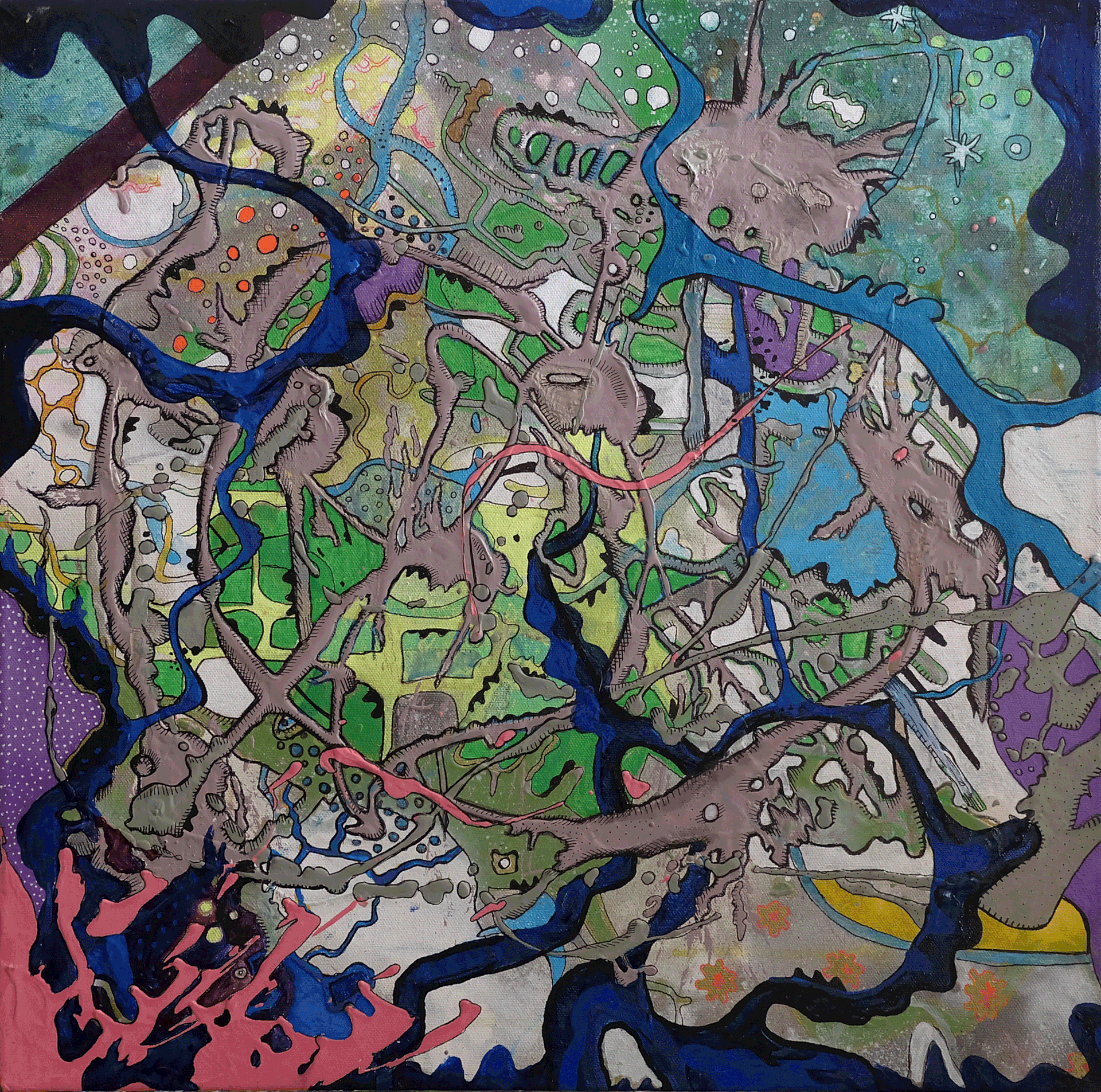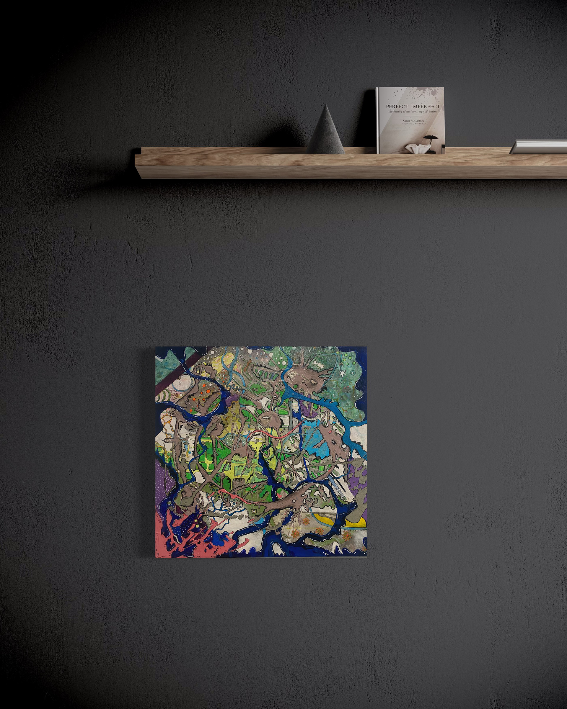 I painted this back in 2011 and it marked a change in my artistic style. We had some matte black paint left from painting our daughter Stella’s crib, and I decided to use it to create a piece depicting a rainbow battling a tornado. The swirling movement on the canvas creates the illusion of bats desperately trying to evade the destructive force of the tornado. The chaotic dance of the swirl captures the frantic struggle for survival as the bats frantically dart and weave through the tumultuous winds, their wingtips brushing against the edges of the canvas as they fight for escape.