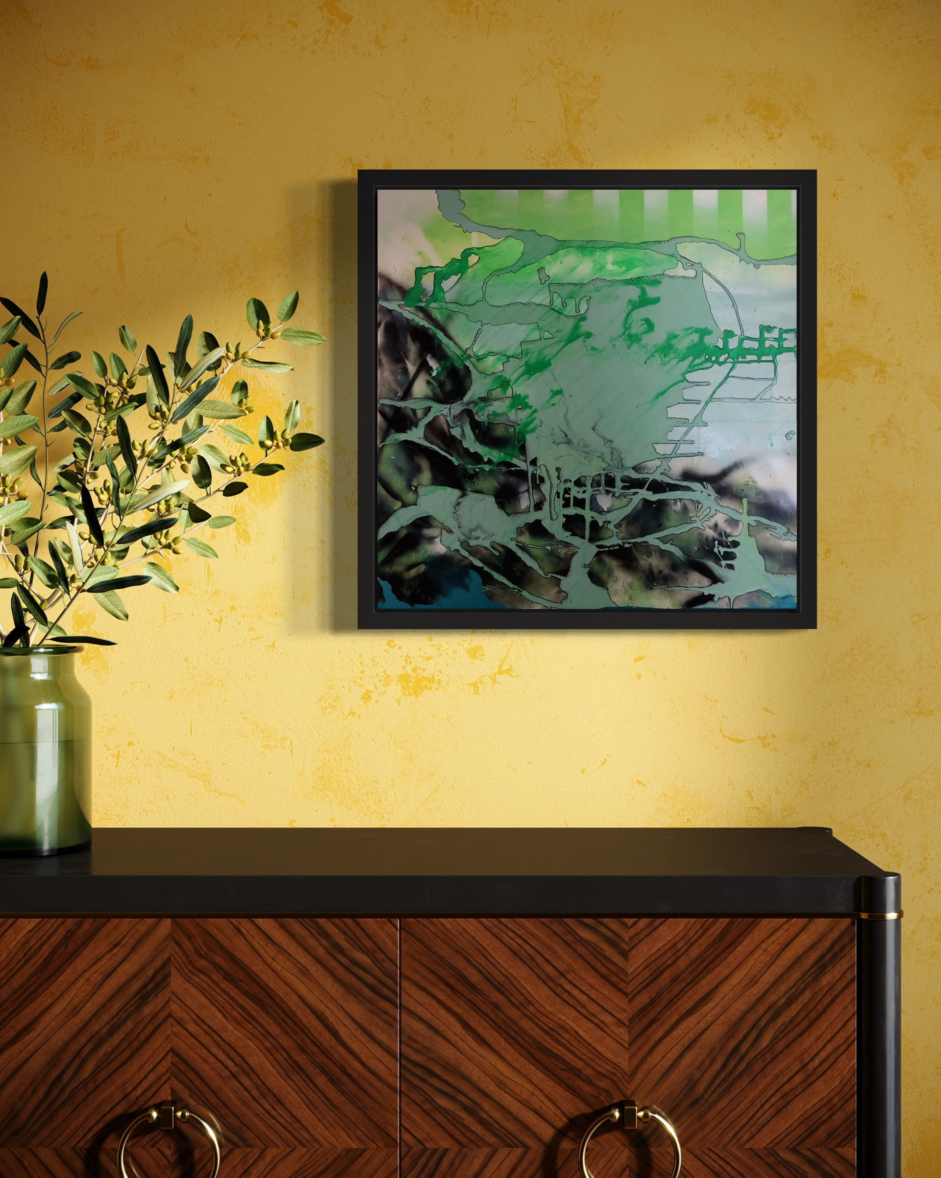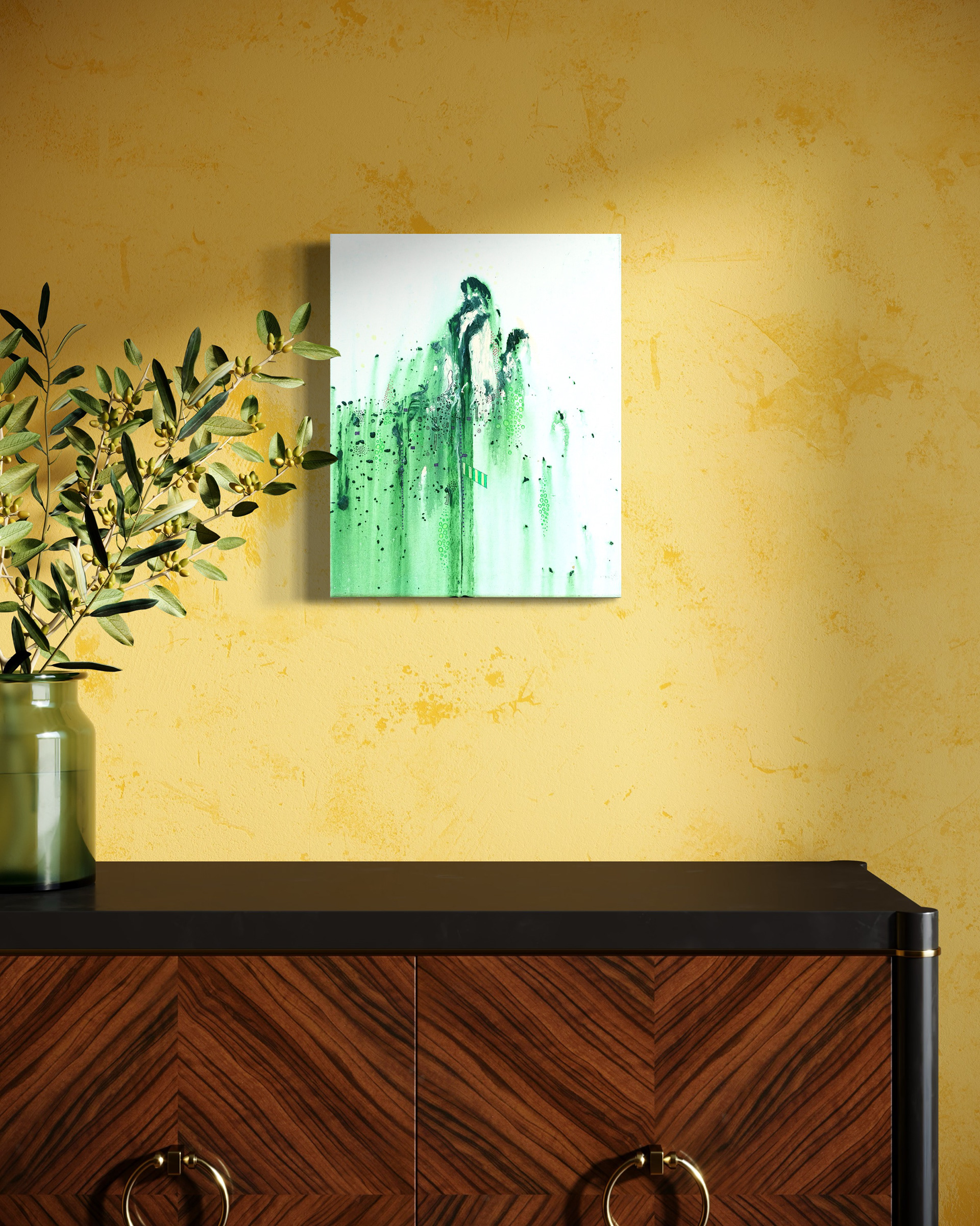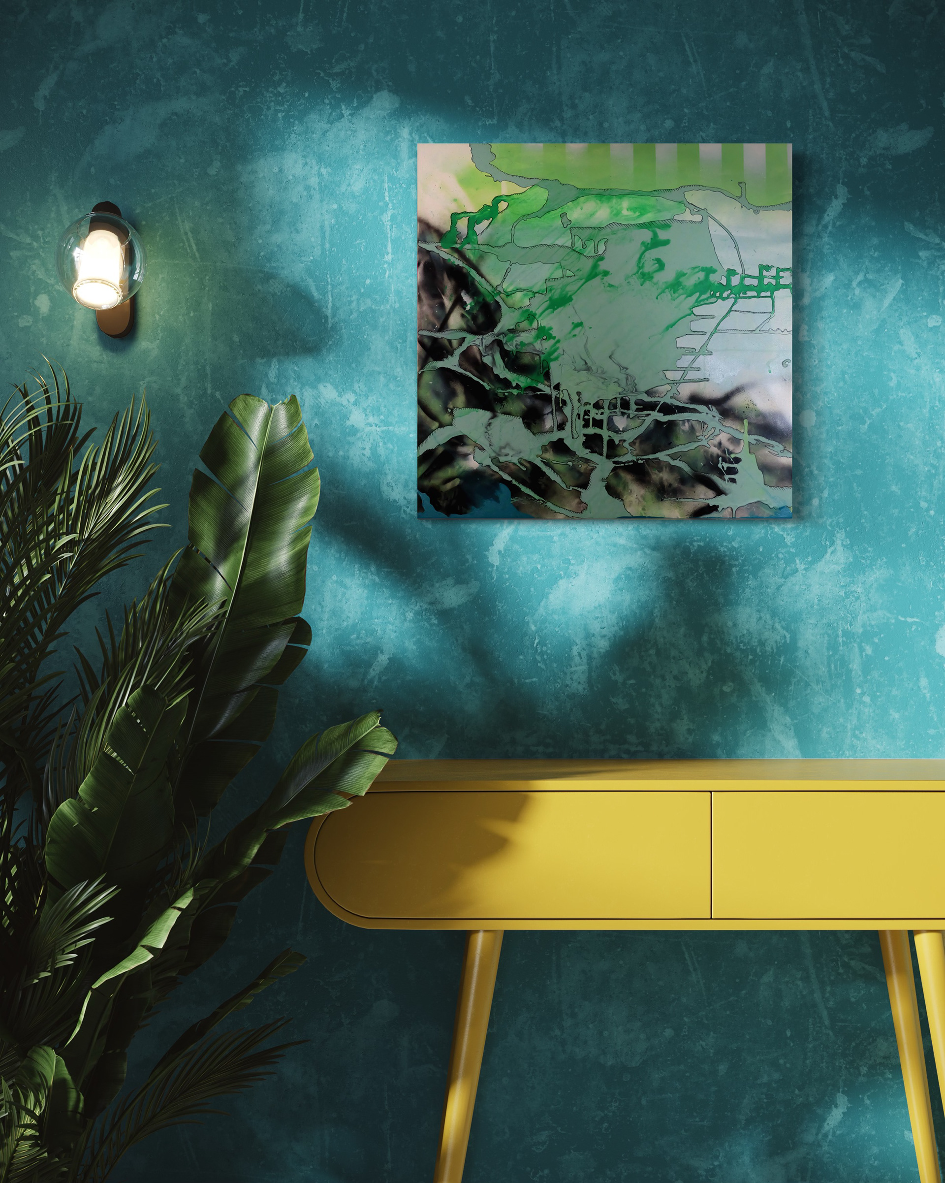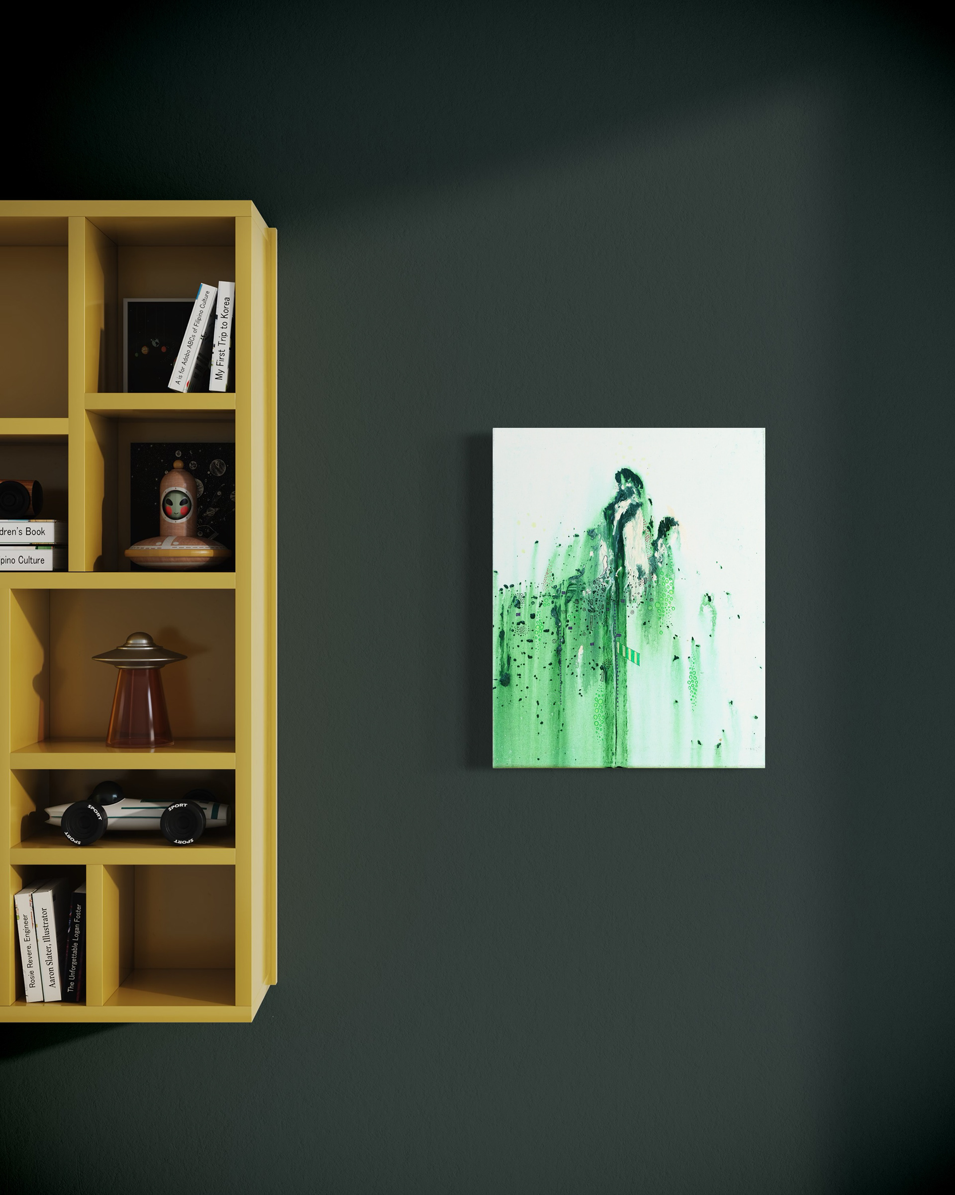This exquisite painting is the latest addition to my collection of abstract pieces. I carefully positioned my easel on a secluded cove in Palos Verdes, California, surrounded by the rugged beauty of the coastline. As I stood there, I allowed myself to become completely immersed in the tranquil atmosphere, and I channeled the essence of that moment onto my canvas. The day was overcast, casting a muted, mystical light over the Pacific Ocean, which displayed a subtle green tint. The air was thick with the unmistakable scent of salt water, adding to the sensory experience of capturing this scene.